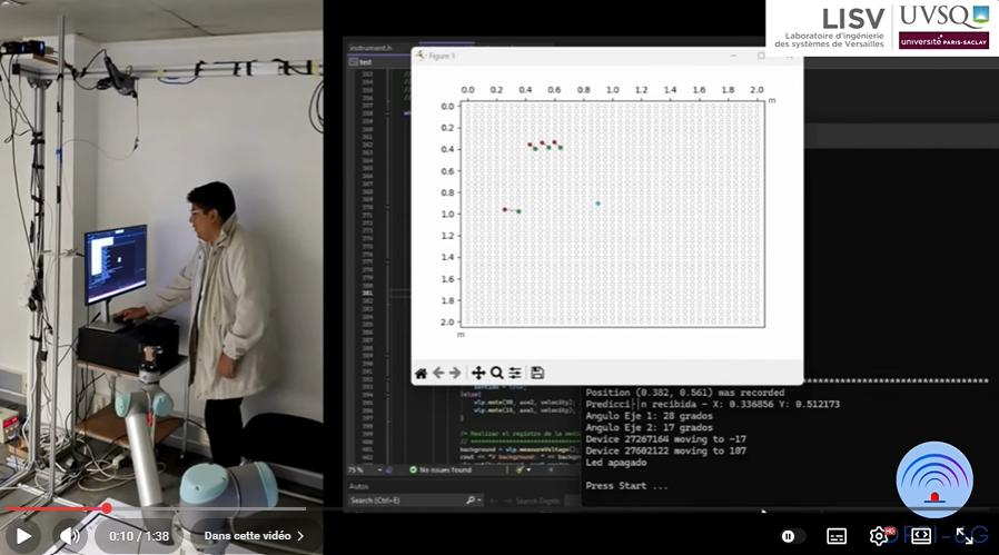 This demonstration showcases the process of estimating the user's equipment position. At the beginning, the robot moves the user's equipment to a random location. This position is displayed as a green dot in the figure on the right, which provides...